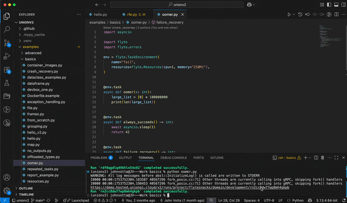 Flyte 2 is an agent harness, so pipelines that fail can recover and continue where they left off. It uses infrastructure-as-context to handle both logic and infrastructure failures autonomously. The workflows and agents on Flyte 2 are self-healing. With built-in caching, retries, and support for custom error handling, Flyte ensures that failures are isolated and never bring down your entire workflow.